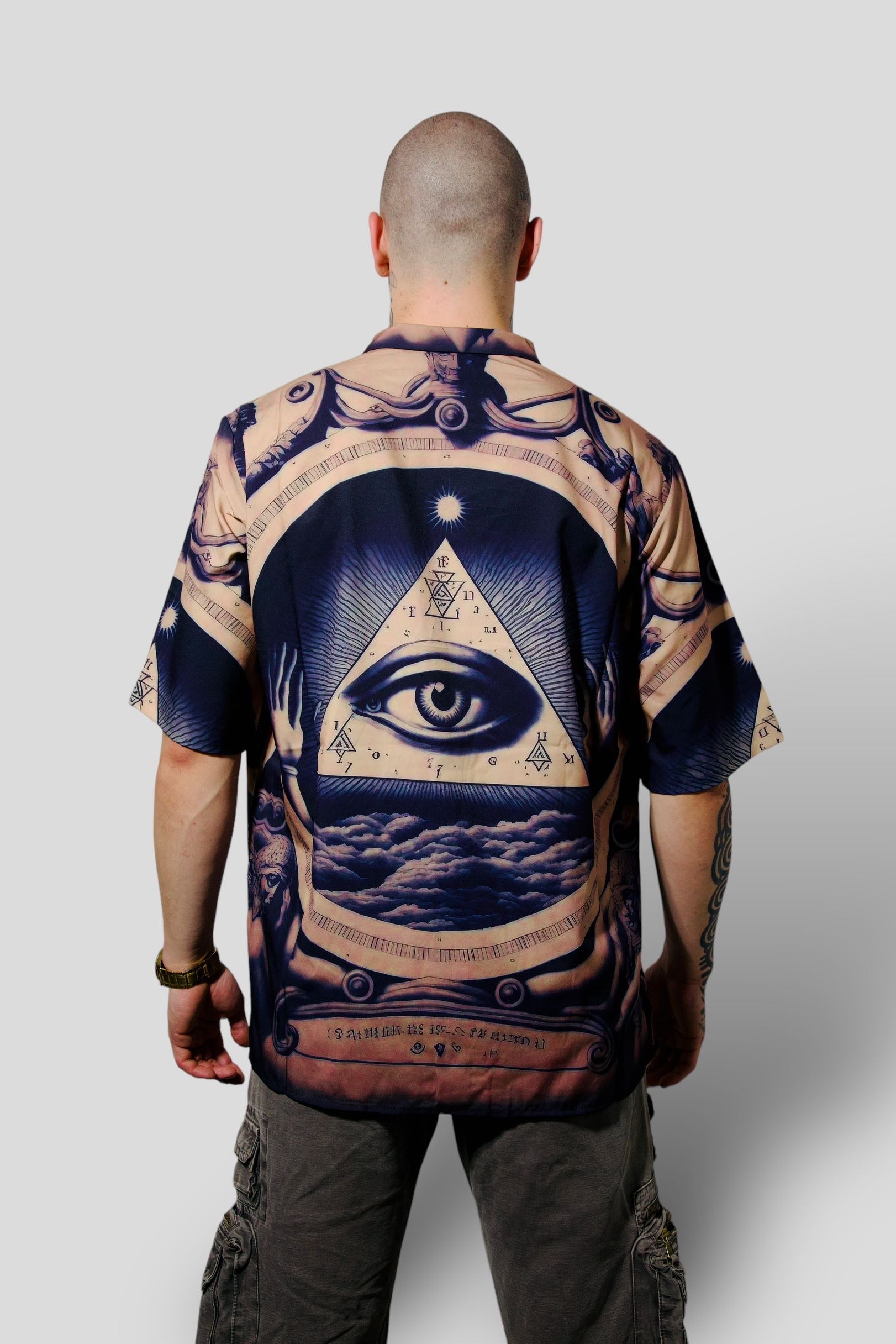 Esta camisa representa la conciencia del mundo capitalista en el que vivimos, donde la sociedad está estructurada como una pirámide donde pocas personas tienen poder y dominan la mayoría. Usar esta camisa simboliza el compromiso de comprender esta realidad y tratar de cambiarla. En la parte posterior de la camisa hay un diseño piramidal con el ojo que todo ve, un símbolo de un sistema que controla y supervisa la sociedad. La camisa representa una invitación para darse cuenta de la realidad en la que vivimos y luchamos por una sociedad más justa y justa.