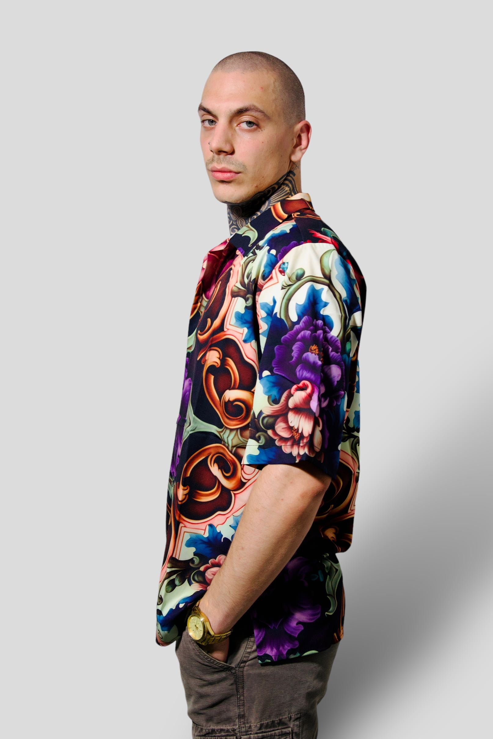 Exclusive design- This shirt presents a mix of baroque flowers and decorations, which symbolize the union between natural and artificial beauty. The balance between simplicity and complexity is represented by the combination of these two elements, inviting those who wear it to look beyond the external appearance. The shirt is an elegant and refined garment, perfect for expressing your personal style and individuality. The floral print and baroque decorations are mixed harmoniously, creating an original and effective design