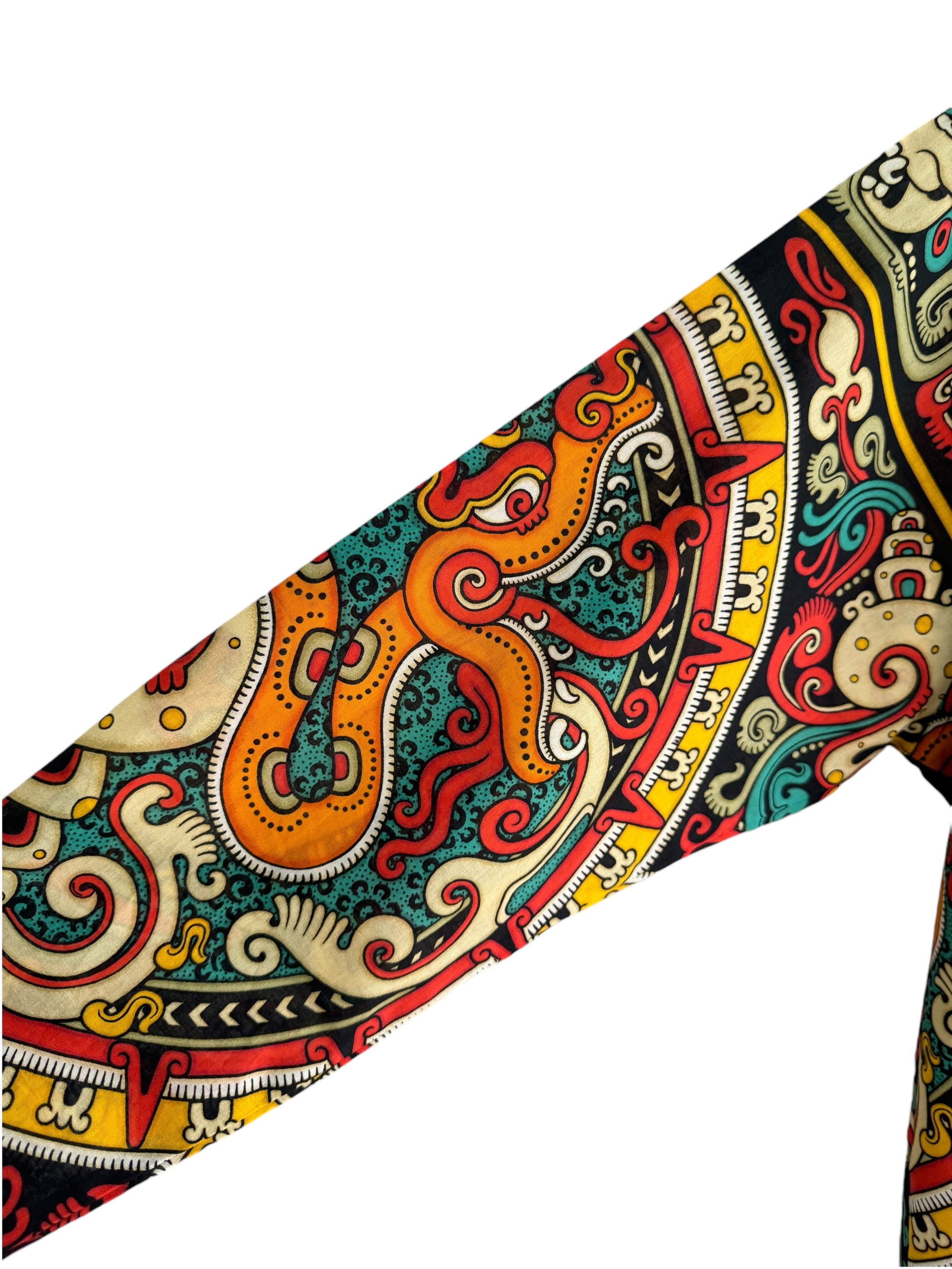 DESIGN ESCLUSIVO - Il design si basa sulla dualità, dove gli opposti si fondono per diventare complementari e creare la grande danza della vita. La parte anteriore rappresenta il tangibile e l'intangibile, mentre la parte posteriore rappresenta l'etereo-materiale e il caldo-freddo. Le maniche rappresentano la vita e la morte. Lo sfondo è decorato con ornamenti che rappresentano le nuvole mentre [ la parte inferiore rappresenta la terra (solo nella versione a maniche lunghe)] e la parte superiore il cielo.