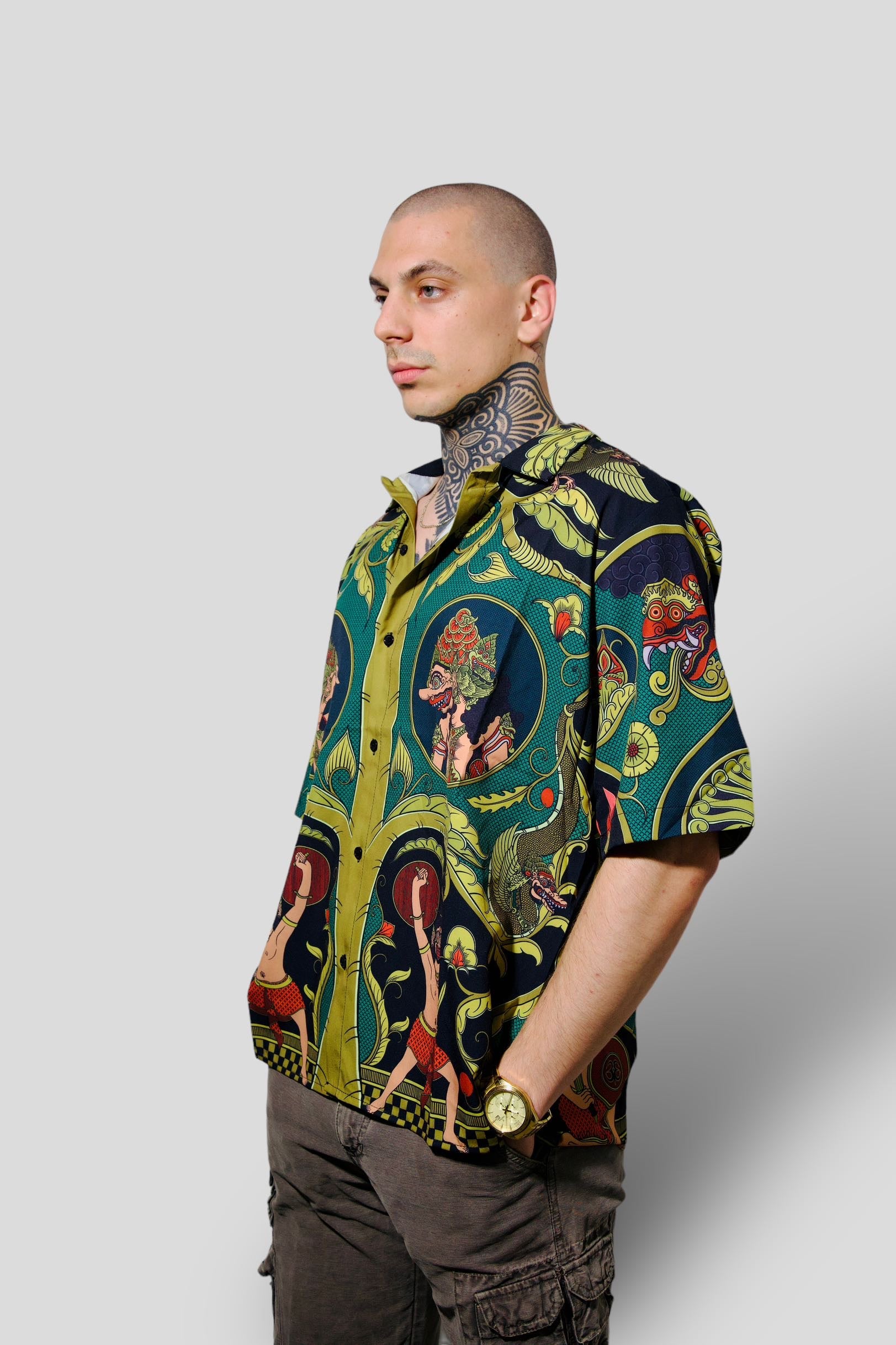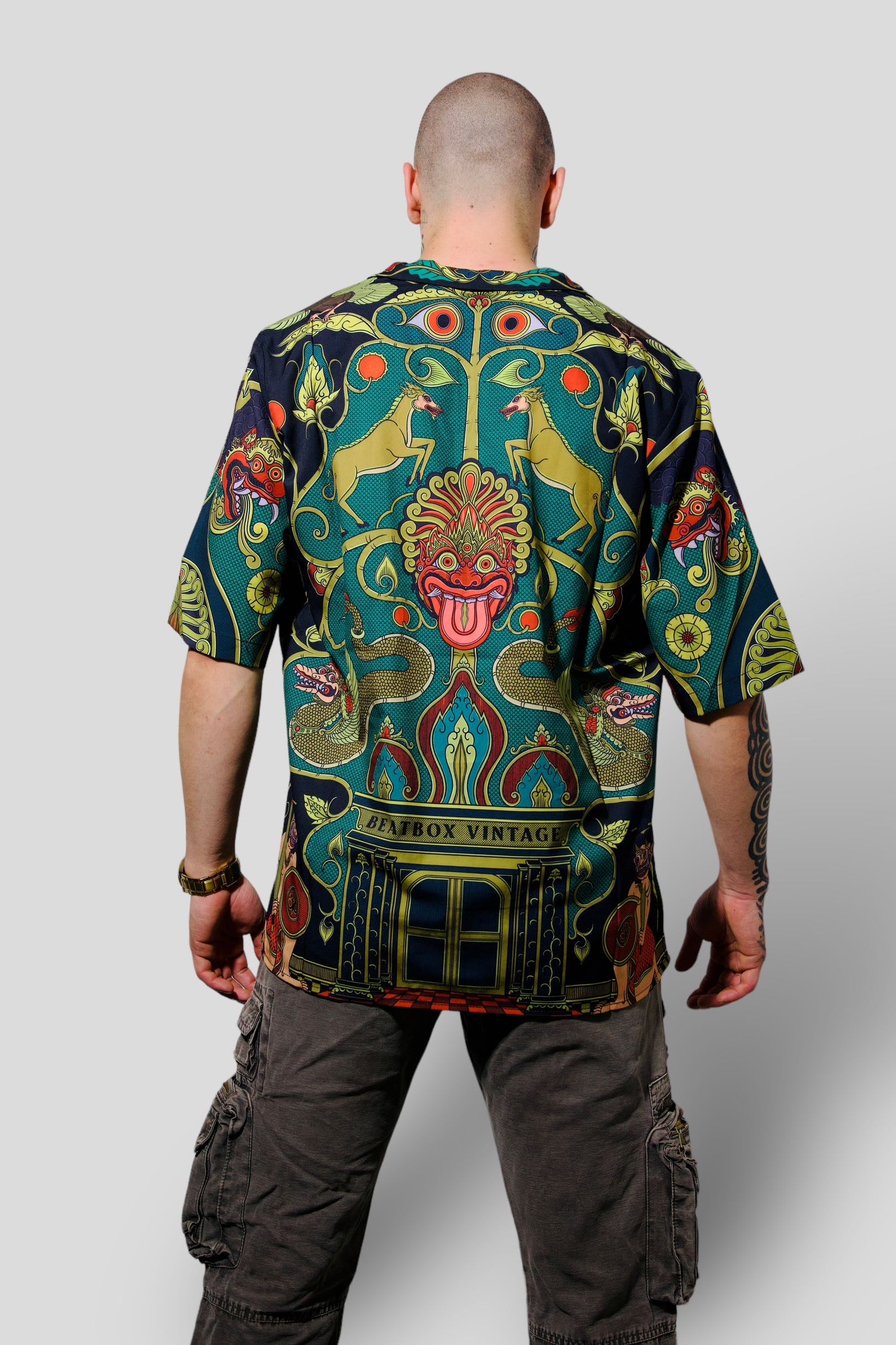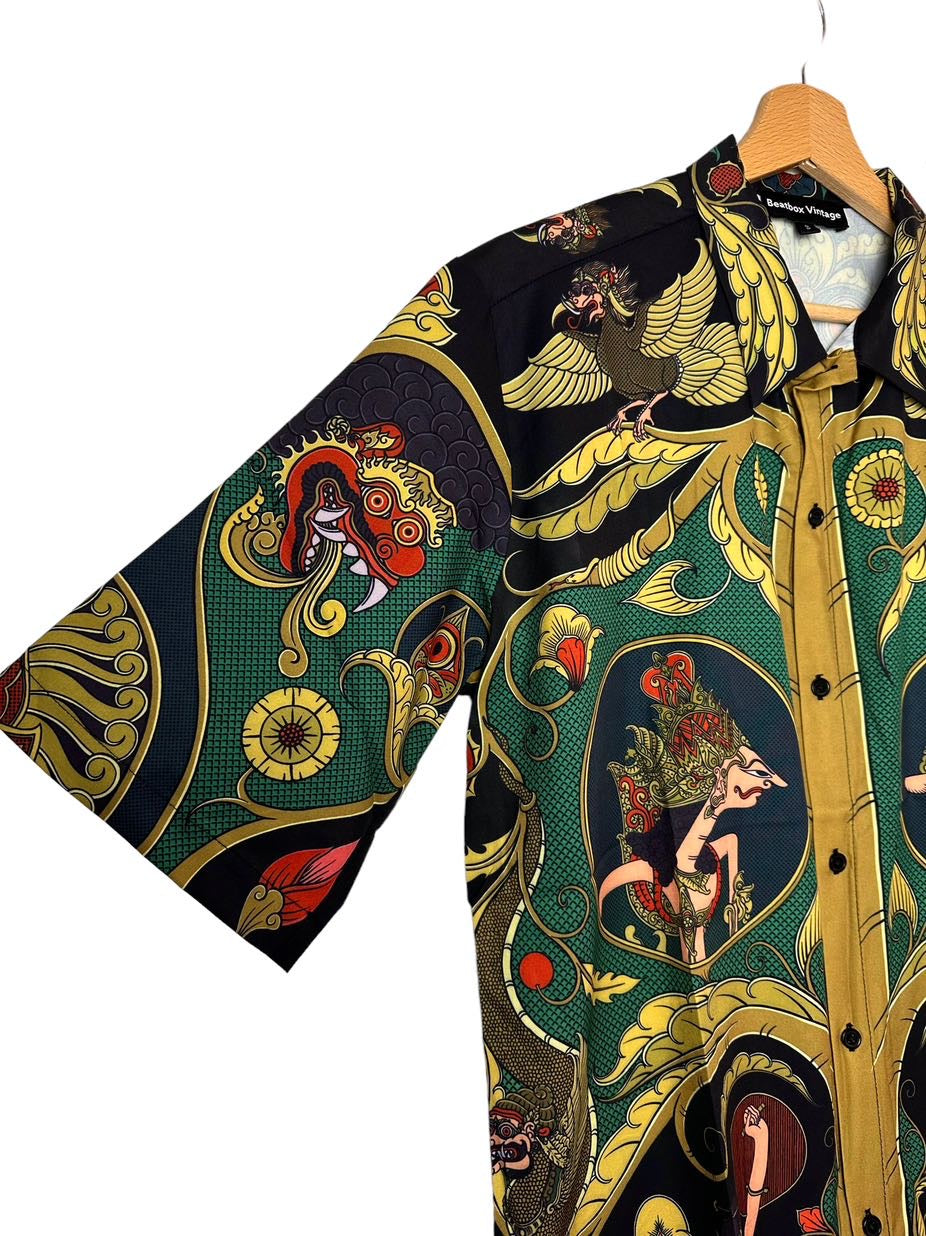 Vintage short -sleeved beatbox shirt with beautiful print designed by an Indonesian artist for us.